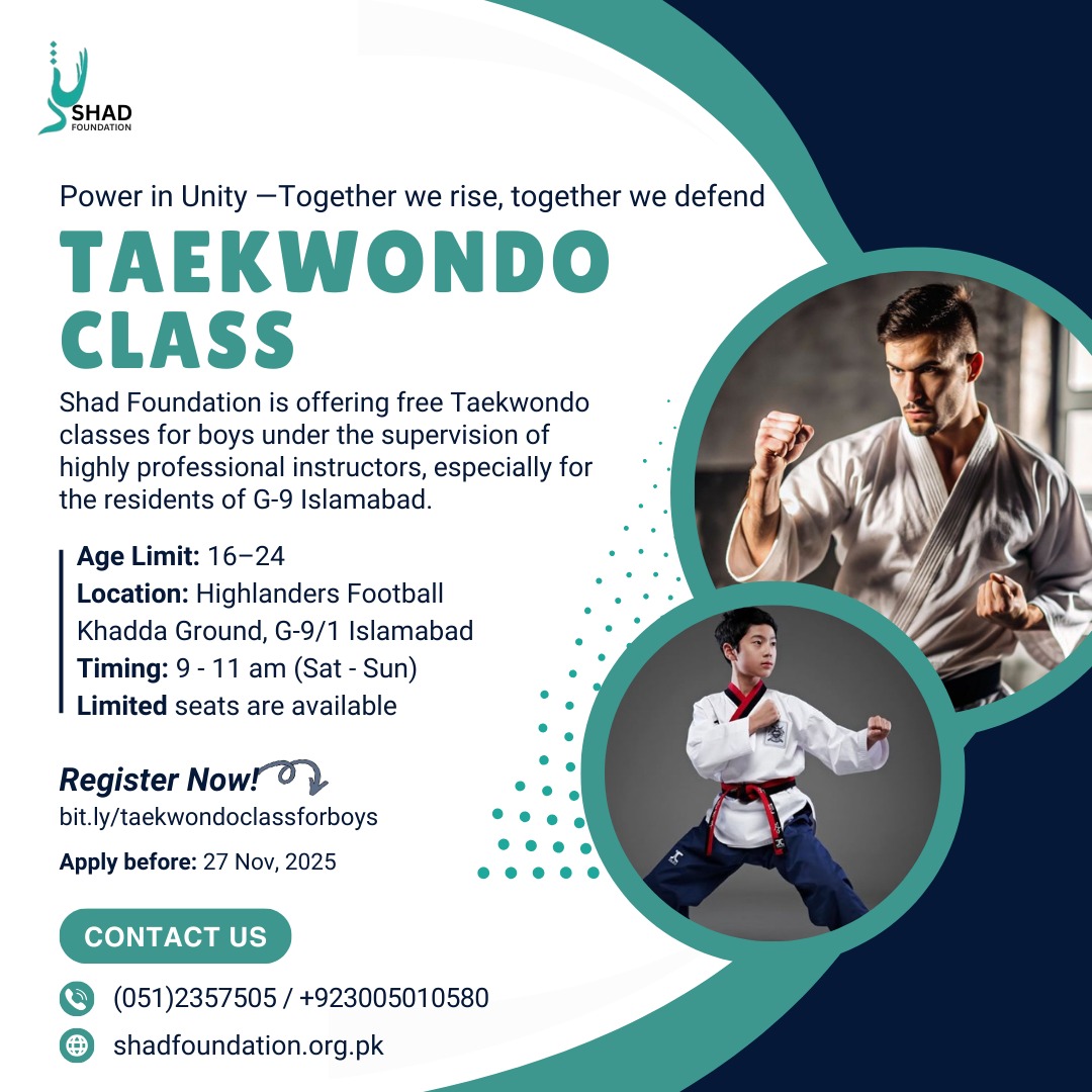 Shad Foundation is offering FREE Taekwondo training for boys (ages 16–24) to promote fitness, confidence, and healthy community engagement. Classes will be conducted by professional and certified instructors, ensuring safe and skill-based learning.
