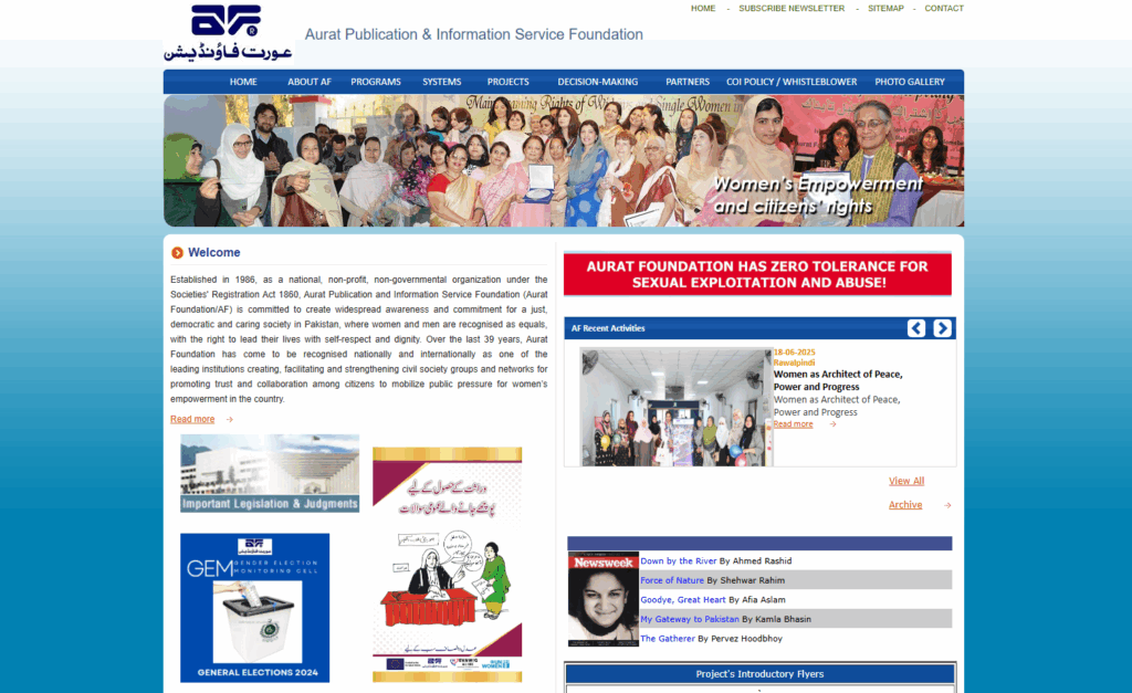 Established in 1986, Aurat Foundation is one of Pakistan’s most influential women-rights organisations. The foundation’s core mission revolves around enabling women to gain access to knowledge, resources, and decision-making platforms. It has played a critical role in advocating for gender-inclusive policies, legal reforms, women’s political representation, and access to justice.
